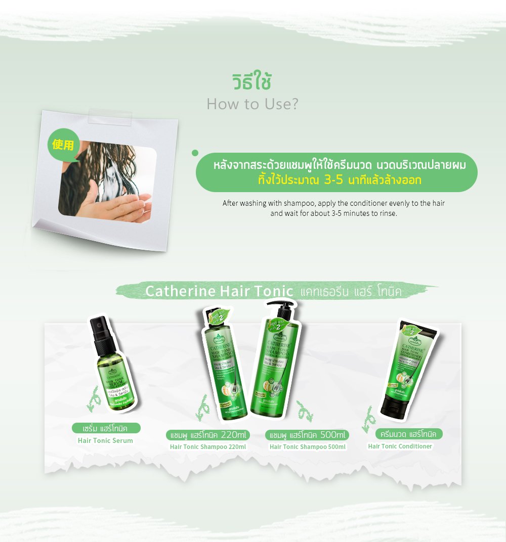 วิธีใช้ : หลังสระผมด้วยแชมพู ชโลมครีมนวดบนหนังศีรษะและเส้นผม นวดให้ทั่วทิ้งไว้ 3-5 นาที แล้วล้างออกด้วยน้ำสะอาด