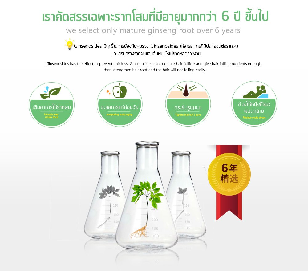 ด้วยคุณค่าโสม และวิตามิน H (ไบโอติน) B3 B5 เข้มข้น ช่วยให้ผมนุ่มสลวย เงางาม มีน้ำหนัก จัดทรงง่าย สุขภาพแข็งแรง ควบคุมความมัน ป้องกันผมขาดหลุดร่วง ผมแลดูหนาดกดำและยาวไวขึ้น ปราศจากแอลกอฮอล์ และสารกันเสียกลุ่มพาราเบน