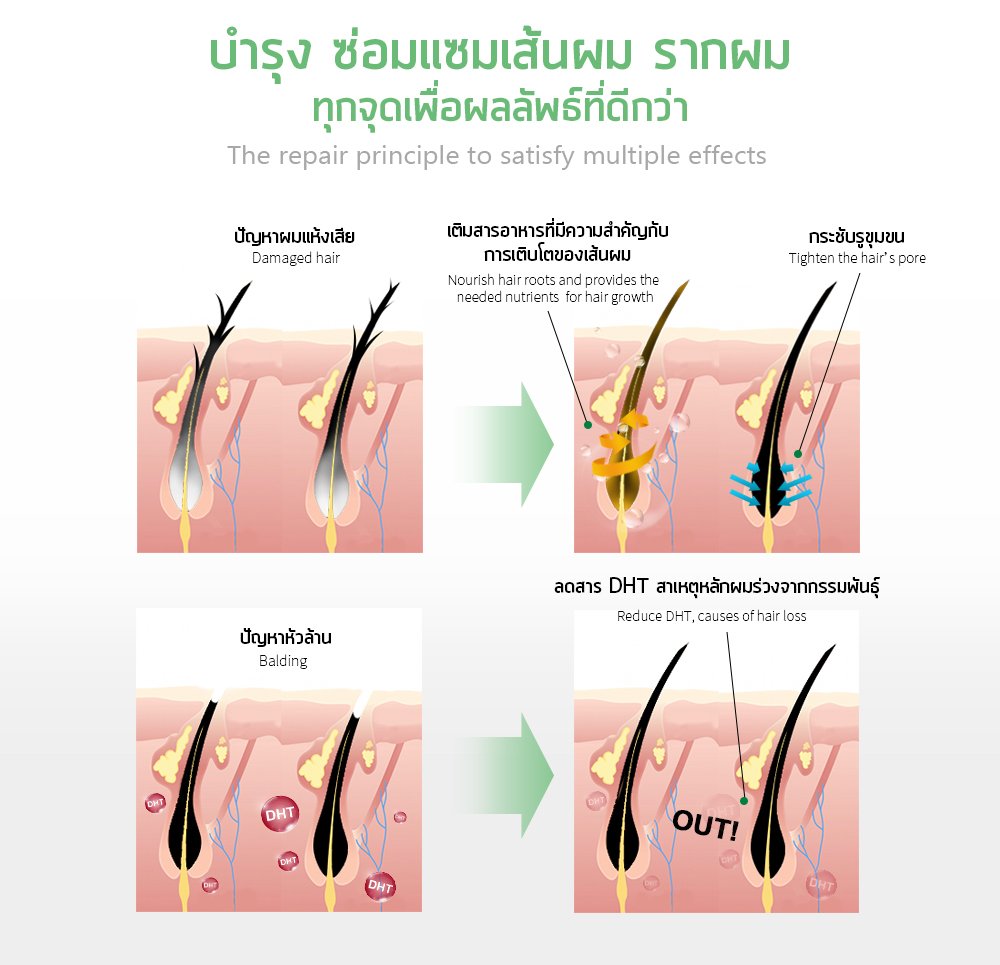 Extra concentrated with ginseng extract, Biotin, Vittamin B3 and Vittamin B5 free from alcohol and paraben. Effectively improve hair softness smoothness and slikness. Help to strenghten hair root, promote hair browth and sebum control.